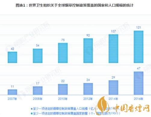 世界衛(wèi)生組織(World Health Organization,簡(jiǎn)稱(chēng)WHO)發(fā)布的主題為監(jiān)測(cè)煙草使用與預(yù)防政策《2017年全球煙草流行報(bào)告》顯示,當(dāng)前全球控?zé)熣叩母采w面繼續(xù)擴(kuò)大,全球共有121個(gè)國(guó)家共47億人口(全球近三分之二的人口)受到控?zé)熣叩挠绊?,目前仍?4個(gè)國(guó)家共27億人未受到控?zé)熣叩母采w。此外,雖然部分國(guó)家和地區(qū)的卷煙消費(fèi)量有所下滑,全球卷煙消費(fèi)的增速放緩,但全球吸煙人口數(shù)量仍在不斷增加。