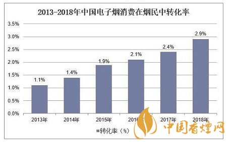 據(jù)統(tǒng)計(jì),2018年中國(guó)電子煙消費(fèi)在煙民中轉(zhuǎn)化率(新型煙草消費(fèi)者占煙民比例)約為2.9%。