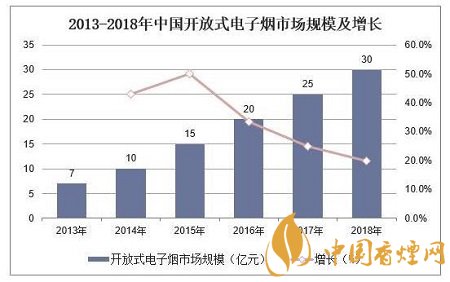 據(jù)統(tǒng)計(jì),2018年中國(guó)開放式電子煙市場(chǎng)規(guī)模為30億元,同比增長(zhǎng)20%。