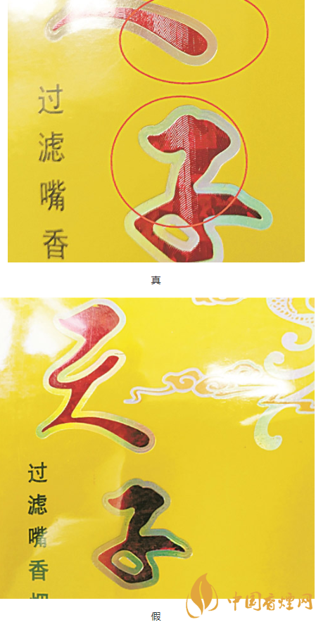 假煙:印刷粗糙,圖案模糊,祥云圖案無凹凸感。