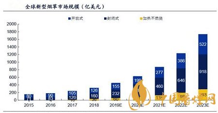 與傳統(tǒng)卷煙市場衰退呈鮮明對比的是新型煙草市場規(guī)模的逐年提升。全球新型煙 草市場規(guī)模以 27.9%的復合年增長率從 2013 年的 94 億美元迅速增加至 2018 年的 323 億美元。弗若斯特沙利文預計到 2023 年全球新型煙草市場規(guī)模將高達 1734 億美元。新型煙草煙作為一種替代香煙的電子產(chǎn)品,有著與香煙類似的外 觀、煙霧、味道和感覺。而與香煙相比卻不含有香煙煙霧中的 7000 種有害化學 成分,因此受到越來越多人的青睞。