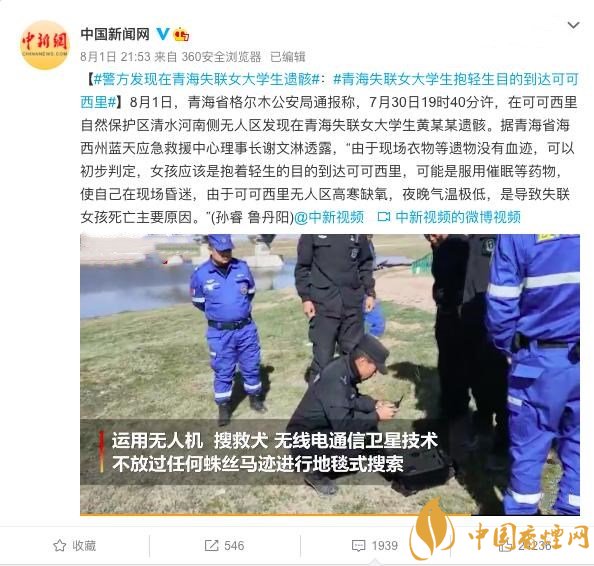 以上就是香煙網(wǎng)對(duì)于可可西里失聯(lián)女大學(xué)生搜救畫(huà)面曝光事件的介紹報(bào)道,據(jù)消息得知,女大學(xué)生黃某某經(jīng)過(guò)當(dāng)前偵查,已排除他殺的可能,初步判定,女孩應(yīng)該是抱著輕生的目的到達(dá)可可西里。我們將持續(xù)關(guān)注相關(guān)事件的后續(xù)進(jìn)程!