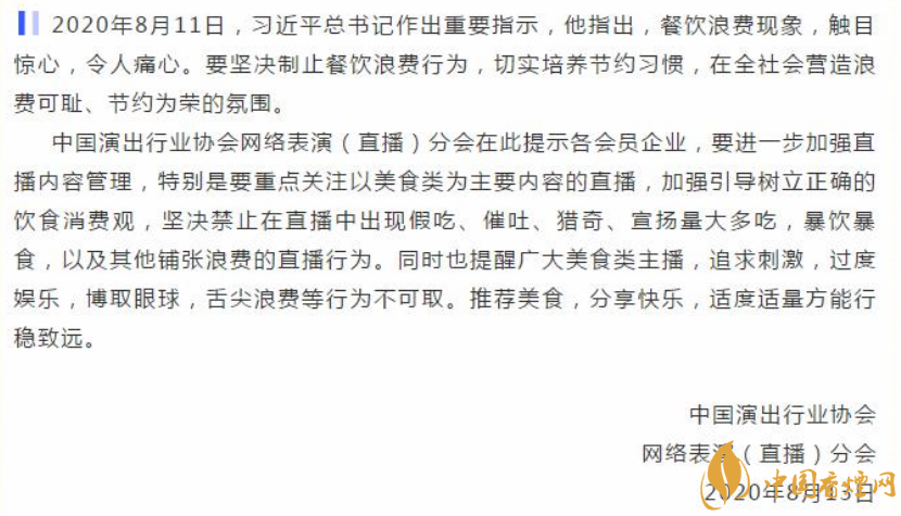 據(jù)中國演出行業(yè)協(xié)會官方微信消息,中國演出行業(yè)協(xié)會網(wǎng)絡(luò)表演 ( 直播 ) 分會在此提示各會員企業(yè),要進一步加強直播內(nèi)容管理,特別是要重點關(guān)注以美食類為主要內(nèi)容的直播,加強引導樹立正確的飲食消費觀,堅決禁止在直播中出現(xiàn)假吃、催吐、獵奇、宣揚量大多吃,暴飲暴食,以及其他鋪張浪費的直播行為。同時也提醒廣大美食類主播,追求刺激,過度娛樂,博取眼球,舌尖浪費等行為不可取。推薦美食,分享快樂,適度適量方能行穩(wěn)致遠。