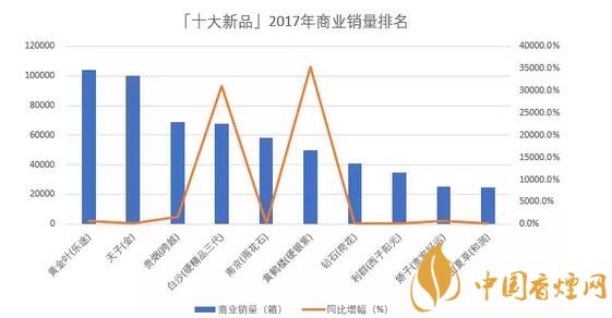 以商業(yè)銷量衡量,「十大新品」2017年合計銷量57.4萬箱,同比增加40.1萬箱,增長230.8%;十款產(chǎn)品的平均銷量突破5萬箱,平均增量達到4萬箱;銷量最大的「黃金葉(樂途)」突破10萬箱,最小的「冬蟲夏草(和潤)」也有2.4萬箱;增量最大的「黃金葉(樂途)」超過9萬箱,最少的「利群(西子陽光)」同比增加1.1萬箱。