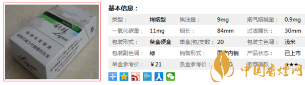 這款煙,焦油量:9mg 煙氣煙堿量:0.9mg 一氧化碳量:11mg 煙長(zhǎng):84mm 過(guò)濾嘴:30mm 相對(duì)于其他品種的香煙煙草可吸部分較短,但是很耐抽。