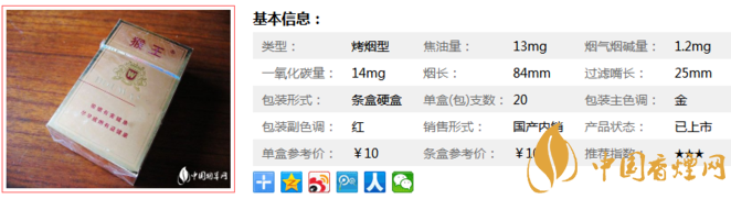 猴王磨砂,煙長84mm,焦油量13mg,煙堿量1.2mg,一氧化碳量:14mg,以云、貴、豫、陜等省等高檔煙葉為原料,人工選葉、去梗,并配有特制進(jìn)口專用香精。