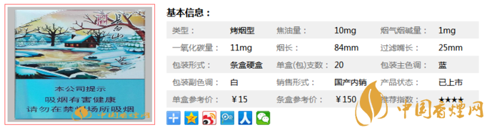 | 類型 :烤煙型 | 焦油量 :10mg | 煙氣煙堿量 :1mg | 一氧化碳量 :11mg |