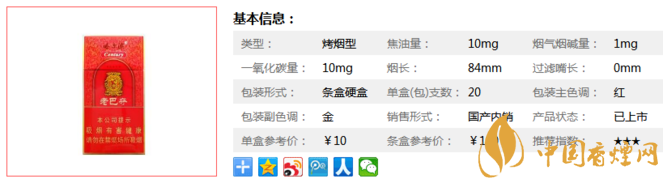 | 類型 :烤煙型 | 焦油量 :10mg | 煙氣煙堿量 :1mg | 一氧化碳量 :10mg |