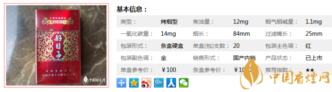 | 類(lèi)型 :烤煙型 | 焦油量 :12mg | 煙氣煙堿量 :1.1mg | 一氧化碳量 :14mg |