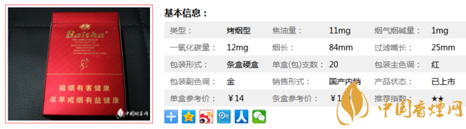 該產(chǎn)品選用醇化而具有獨(dú)特香氣的國(guó)內(nèi)外優(yōu)質(zhì)原料,輔于天然植物精華香精香料,依托紅塔集團(tuán)技術(shù)中心雄厚的技術(shù)力量,運(yùn)用當(dāng)前業(yè)內(nèi)先進(jìn)的生物減害制劑和激光打孔技術(shù),突出“高科技、高香氣、低焦油、低危害”的風(fēng)格特點(diǎn)。下面我們一起來(lái)看白沙尚品紅的參數(shù)信息:焦油量:11mg. 煙堿量:1mg. 一氧化碳量:12mg.