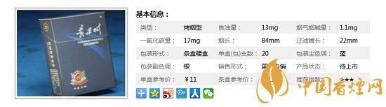 | 類型 :烤煙型 | 焦油量 :13mg | 煙氣煙堿量 :1.1mg | 一氧化碳量 :14mg |