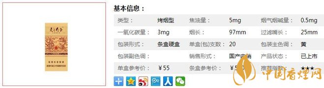 | 類型 :烤煙型 | 焦油量 :5mg | 煙氣煙堿量 :0.5mg | 一氧化碳量 :3mg |