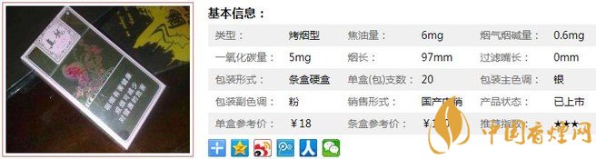 | 類型 :烤煙型 | 焦油量 :6mg | 煙氣煙堿量 :0.6mg | 一氧化碳量 :5mg |