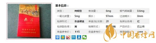| 類型 :烤煙型 | 焦油量 :6mg | 煙氣煙堿量 :0.6mg | 一氧化碳量 :5mg |