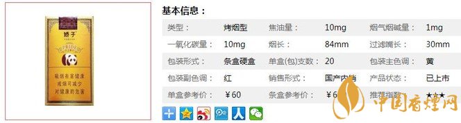 | 類型 :烤煙型 | 焦油量 :10mg | 煙氣煙堿量 :1.1mg | 一氧化碳量 :11mg |