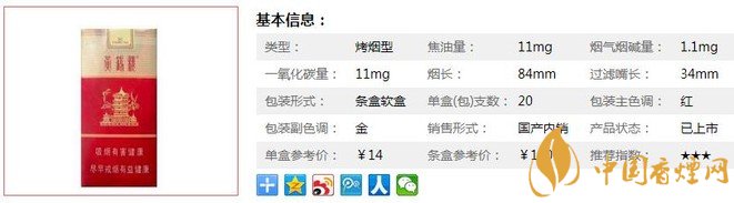 | 類型 :烤煙型 | 焦油量 :11mg | 煙氣煙堿量 :1.1mg | 一氧化碳量 :11mg |