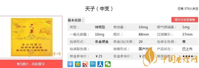 以上便是由小編為大家介紹的關(guān)于天子(中支)的相關(guān)信息。品味一番后,小編也就不奇怪天子(中支)的好評(píng)率了。一個(gè)產(chǎn)品自身過硬,總是不缺伯樂的。想要了解更多內(nèi)容請點(diǎn)擊:雪蓮細(xì)支1960多少錢一包 雪蓮細(xì)支1960口感及參數(shù)介紹