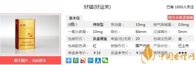 好貓好運(yùn)來煙支長84mm,采用優(yōu)質(zhì)有機(jī)原料、特色天然香料、獨(dú)有生物技術(shù)、特色工藝技術(shù)精心打造的一款高附加值產(chǎn)品。下面我們一起來看好貓好運(yùn)來的參數(shù)信息:焦油量:10mg 煙堿量:0.9mg 一氧化碳量:10mg