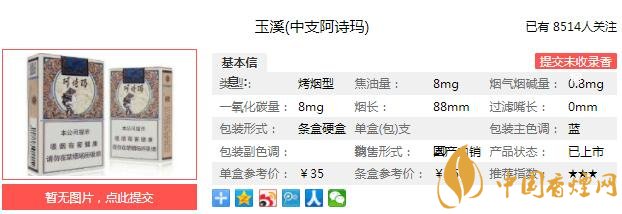 玉溪中支阿詩瑪煙支長88mm,濾嘴的中部是阿詩瑪標(biāo)志性的側(cè)影頭像。濾嘴下部是上下兩個(gè)圓環(huán),中間正反印制著阿詩瑪和Ashima標(biāo)識。下面我們一起來看玉溪中支阿詩瑪?shù)膮?shù)信息:焦油量:8mg 煙堿量:0.8mg 一氧化碳量:8mg