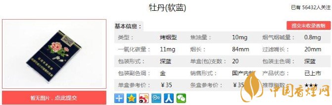 以上便是香煙網(wǎng)小編為大家介紹的關于清新包裝優(yōu)雅煙香,牡丹軟藍的價格35元一包!的相關信息,看完之后大家是不是對于牡丹(軟藍)的相關信息更加了解呢。大家還想查詢更多的相關內容歡迎點擊:牡丹金細支多少錢一包 牡丹金細支口感及參數(shù)介紹