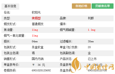 | 利群(西子陽光) | 烤煙型 | 84mm 細(xì)支硬 | 310元/條 | 浙江中煙工業(yè)有限責(zé)任公司 |