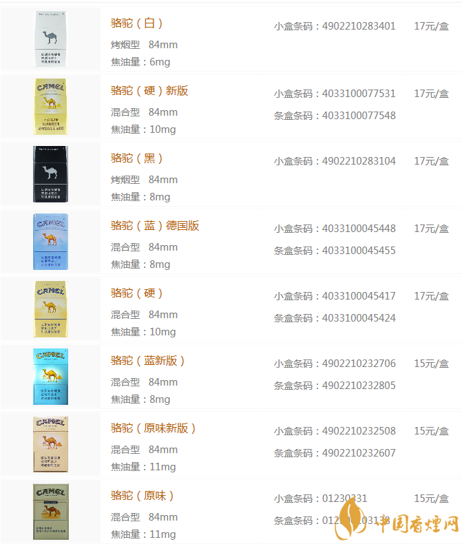 駱駝香煙品種包括了,駱駝(無嘴)、駱駝(軟黃)、駱駝(原味中免)、駱駝(藍(lán)中免)、駱駝(薄荷)、駱駝(特醇俄版)、駱駝(八角藍(lán))、駱駝(硬藍(lán)99s)、駱駝(硬黃99s)等。