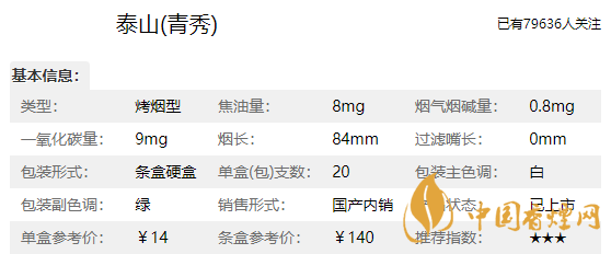 泰山青秀煙長84mm,屬于低焦油系列香煙,煙氣較淡,入口輕柔,煙勁挺小的外觀很大氣到喉嚨里后也很順暢在這個價位里是挺不錯的一款煙了。下面我們一起來看泰山青秀的參數(shù)信息:焦油量:8mg煙堿量:0.8mg一氧化碳量:9mg。