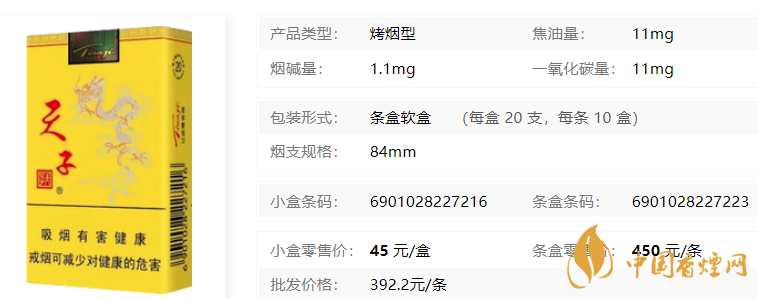 通過上面的介紹,2020天子(軟黃)香煙多少錢一包以及最新天子(軟黃)香煙價(jià)格表圖大家都了解了,它定位高端,吸味好,持灰更是讓人刮目相看,超值的一款香煙。了解更多香煙相關(guān)咨詢,請(qǐng)關(guān)注香煙網(wǎng)。