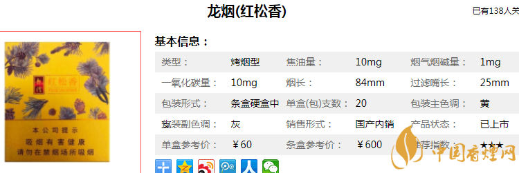 獨特的紅松香爆珠口味十分罕見,龍煙(紅松香)2017年中國喜慶產(chǎn)業(yè)十大領(lǐng)袖品牌,抽下來煙友表示優(yōu)點淡,適合新手。