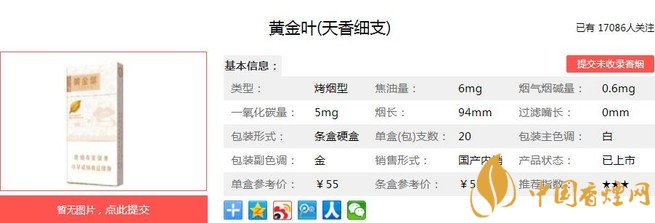 黃金葉天香細支類別為“高一類A(細支)潛力規(guī)格”,烤煙類型。外包裝沿襲天葉低調(diào)奢華的品系風(fēng)格,一如既往的黃金標準,一絲不茍的手捻精神,和大小天葉系列一脈相承,據(jù)香煙網(wǎng)小編市場調(diào)查它的零售參考價為55元/包。