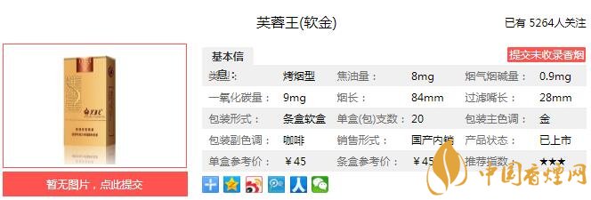 堅(jiān)守芙蓉王品牌的本源真義,摒棄浮躁虛華和過多的人工雕琢,返璞歸真,煙草本香高雅流暢,煙氣細(xì)膩柔和,余味干凈舒適,向消費(fèi)者傳遞出自然煙草香韻。包裝以金色為底,商標(biāo)設(shè)計(jì)上“芙蓉王”篆體字及鑲嵌其中的“王冠”邊紋和諧搭配,動靜相宜,凸顯莊重如鼎的王者意境。 經(jīng)香煙網(wǎng)小編市場調(diào)查芙蓉王軟金售價(jià)為45元/包。