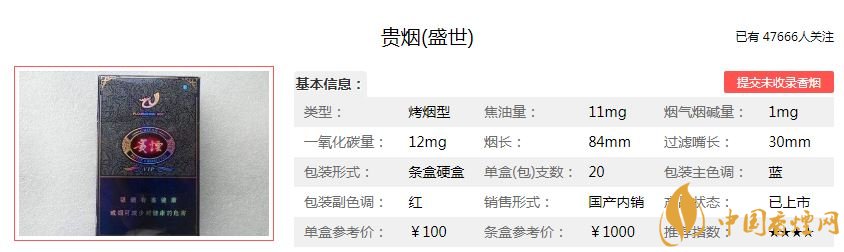 貴煙(盛世)香煙100元/包,這款煙的焦油量:11mg,煙堿量:1.0mg,一氧化碳量:12mg,這款煙采用貴州天柱的珍稀上等煙葉,按照100:1的標(biāo)準(zhǔn)精選加工而成。其煙氣高雅悠長,口味細(xì)膩純正,余味圓潤舒適。
