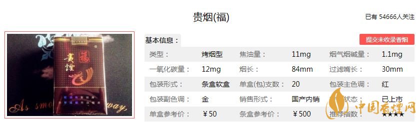 貴煙福香煙50元/包,這款煙的焦油含量11mg,煙氣一氧化碳含量12mg,煙氣煙堿含量1.1mg,煙勁很足,口感舒適。