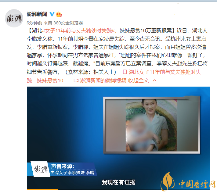 以上就是對湖北女子11年前與丈夫獨處時失蹤,妹妹重新報案的事件報道,具體事件發(fā)展還要等警方調查結果,后續(xù)發(fā)展我們將繼續(xù)跟進。想了解更多時事熱點,請關注香煙網!