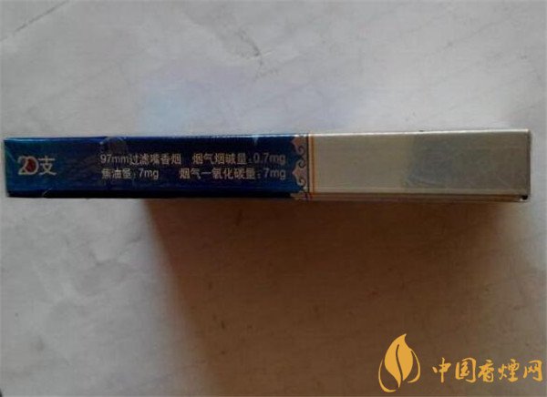 煙盒右側(cè)標注著香煙的理化數(shù)值,標注著過濾嘴香煙長97mm,0.7mg煙氣煙堿量,7mg焦油量,7mg煙氣一氧化碳量,印有主品牌單位名稱,數(shù)量指標20支。