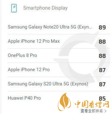 iPhone 12 手機的屏幕表現(xiàn),最終,以88分與一加8 Pro并列第二,列位榜首的目前是Note20 Ultra,分數(shù)為89分。