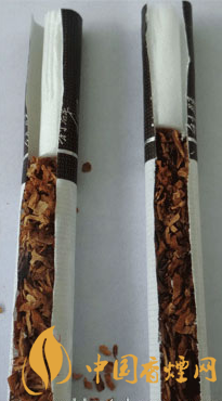 煙支降焦工藝差異比對:真品煙支采用34mm長度的聯(lián)合效益通風(fēng)槽濾嘴,有效降低焦油和一氧化碳量,又充分保留香氣;假煙煙支采用普通單一濾嘴棒,其濾嘴棒長度較短,無法達(dá)降低焦油和一氧化碳量理化數(shù)值效果。