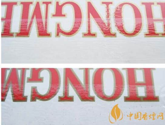(1)真品卷煙商標(biāo)紙顏色白色偏暗;該款假冒卷煙商標(biāo)紙顏色白色亮。(圖1上真下假)