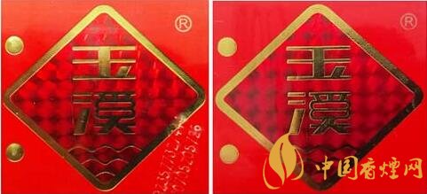 (2)真品卷煙玉溪商標(biāo)燙金圖案,圖案燙金完整清晰,無(wú)漏燙現(xiàn)象,菱形圖案邊緣燙金線呈現(xiàn)凹槽。該款假冒卷煙商標(biāo)燙金圖案燙金有漏燙或掉金,菱形圖案邊緣燙金線平整。(圖2左真右假)