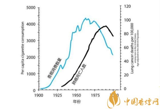 大家一看這個(gè)圖,就會(huì)發(fā)現(xiàn)吸煙數(shù)量和肺癌死亡數(shù)量的曲線幾乎一模一樣,但有大約25年的滯后:吸煙增加,肺癌會(huì)在25年后相應(yīng)增加,吸煙減少,肺癌也會(huì)在25年后相應(yīng)減少。這個(gè)奇特的滯后主要是因?yàn)榉伟┌l(fā)生是個(gè)非常慢的過(guò)程,從癌前變異,到早期癌癥,到晚期癌癥,一般需要10~20年時(shí)間。
