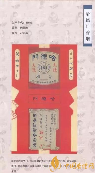 作為早期的洋煙商標(biāo)之一,“哈德門(mén)”商標(biāo)是當(dāng)時(shí)大英煙草公司于1919年注冊(cè)的。后來(lái)通過(guò)英美煙草公司在中國(guó)建廠制造,“哈德門(mén)”成為二十世紀(jì)二三十年代家喻戶曉的著名香煙品牌。由于煙標(biāo)構(gòu)思新穎,色調(diào)幽雅清新,吸食甘涼清香,因此很受煙民的歡迎。