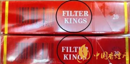 2、側(cè)面英文“FILTER KINGS”:用紫外燈照射真煙“FILTER KINGS”后,移開紫外燈,照射處字體會(huì)由黑色逐漸褪色。假煙無此效果,或變色效果差。(上真下假)