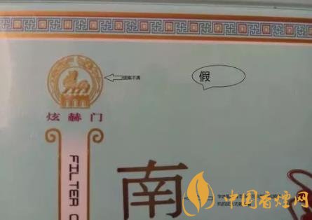 假煙右上角獅子圖標(biāo)模糊不清,字體有毛刺。
