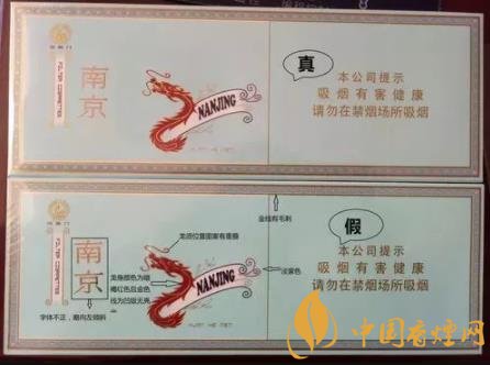 看條盒顏色,真煙為淡藍色,顏色柔和純正;假煙為淺藍色,視覺上顏色不是自然色。看條盒圖標(biāo),真煙“南京”二字字體端正清晰,龍須印刷圖案無重疊,龍身金線為凸版,條盒金邊無毛刺;假煙“南京”二字字體向左微傾,龍須有疊痕錯層,龍身顏色為褐紅色、金線為凹版,條盒金邊有毛刺。