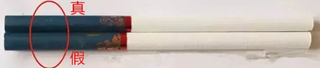 真品卷煙的拉線頭是半圓形的,由于真品卷煙采用機器燙封一次成型,封口比較平整;假冒卷煙的拉線頭呈不規(guī)則形狀,一般采用手工電烙鐵燙封,封口起皺不平。