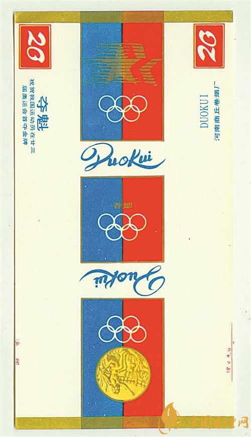 1984年,在美國洛杉磯舉行的第23屆夏季奧運(yùn)會(huì)上,我國射擊運(yùn)動(dòng)員許海峰實(shí)現(xiàn)了我國奧運(yùn)金牌零的突破。為祝賀我國運(yùn)動(dòng)員取得好成績(jī),上世紀(jì)80年代,河南商丘卷煙廠出品了多個(gè)版本的“奪魁”煙標(biāo)。其中一個(gè)版本的“奪魁”煙標(biāo)(圖①),圖案采用紅色、藍(lán)色和金色為主要配色,主版圖案為洛杉磯奧運(yùn)會(huì)會(huì)徽,左側(cè)位置印有“祝賀我國運(yùn)動(dòng)員在廿三屆奧運(yùn)會(huì)首奪金牌”字樣,副版上印有奧運(yùn)會(huì)金牌圖案和奧運(yùn)五環(huán)標(biāo)志。同時(shí)期,山東兗州卷煙廠出品了“五洲”煙標(biāo),主、副版圖案分別為第23屆夏季奧運(yùn)會(huì)會(huì)徽和奧運(yùn)五環(huán)標(biāo)志。