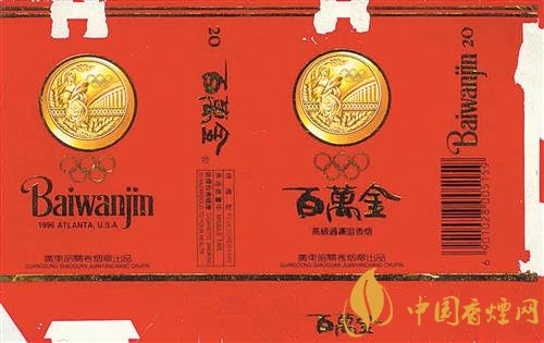 1996年,第26屆夏季奧運(yùn)會(huì)在美國亞特蘭大舉行。上世紀(jì)90年代,廣東韶關(guān)卷煙廠出品了“百萬金”煙標(biāo)(圖②)。該煙標(biāo)以紅色為底色,主、副版上均印有金燦燦的奧運(yùn)金牌以及奧運(yùn)五環(huán)圖案,副版上還印有“1996 ATLANTA USA”字樣。