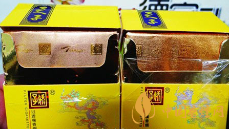 小盒商標(biāo)印刷工藝差異對比:真品小盒正面套印定位燙金“飛龍”圖案鱗片清晰,從頭至尾都能看到定位燙金工藝,紅色貫穿整個龍身,“鱗片”是雪里透紅,栩栩如生;假煙套印定位燙金仿制較差,鱗片無法達到真品的印刷工藝水平,印刷工藝與真品商標(biāo)圖案差異明顯。