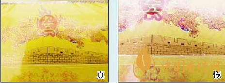 真煙上的城墻圖案印刷精致,城墻磚縫線條工整清晰;假煙的城墻圖案印刷粗糙,燙金效果差,會出現(xiàn)城墻磚縫線條斷開、加粗、模糊等現(xiàn)象。